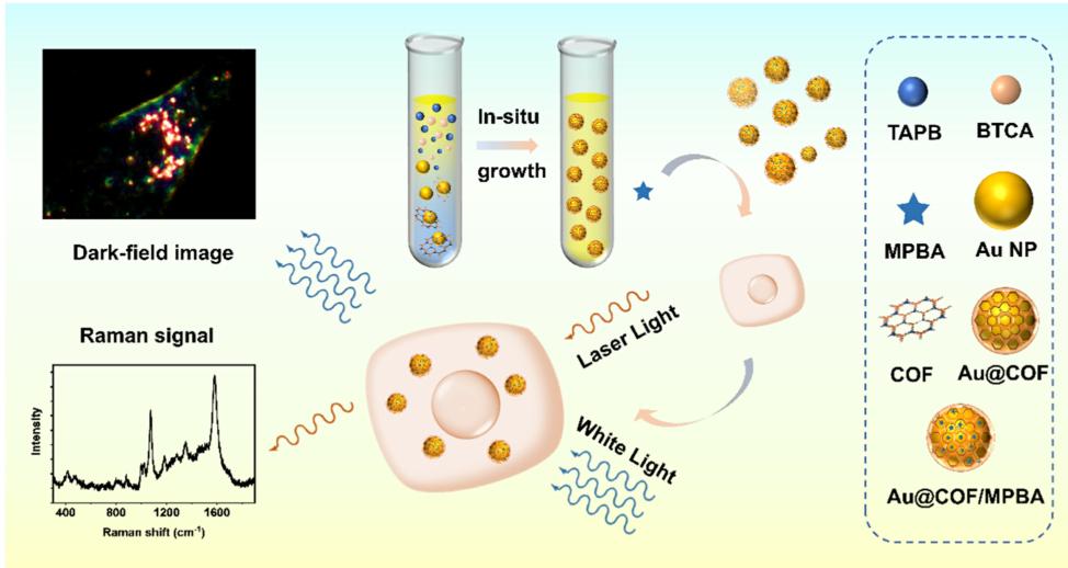 南京師范大學(xué)王琛教授課題組在Au納米粒子上覆蓋二維共價(jià)有機(jī)框架(COFs)構(gòu)建尺寸可控、富集力強(qiáng)、穩(wěn)定性高和生物相容性更好的核殼結(jié)構(gòu)(Au@COF)生物傳感器。并用拉曼光譜/暗場(chǎng)散射成像雙模技術(shù)實(shí)時(shí)監(jiān)測(cè)活細(xì)胞中過(guò)氧化氫代謝物水平。實(shí)驗(yàn)結(jié)果證明,該生物納米傳感器簡(jiǎn)單、高效,可實(shí)現(xiàn)過(guò)氧化氫和細(xì)胞代謝產(chǎn)物的在線檢測(cè)。本研究為開發(fā)基于COF的SERS生物傳感平臺(tái)提供了實(shí)驗(yàn)思路,為細(xì)胞代謝產(chǎn)物相關(guān)疾病早期診斷提供一種有效方法。