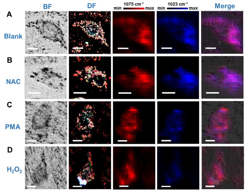 圖6 細(xì)胞內(nèi)不同藥物處理后H2O2的成像圖;(A)未處理的細(xì)胞,(B)2 mg·mL−1的NAC,(C)1 mM PMA和(D)200 mM H2O2;從左到右依次為明場(chǎng)(BF)圖像、暗場(chǎng)(DF)圖像、拉曼Mapping圖像和合成圖像。紅色圖為1075 cm−1拉曼峰Mapping圖,紅色圖為1023 cm−1拉曼峰Mapping圖。Au@COF濃度為0.5nM。