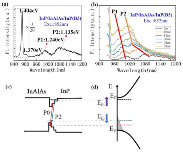 圖3. (a) 具有200納米厚的InP蓋層的InP/InAlAs/InP(樣品B3)在77 K下由852納米激光器(5毫瓦)激發(fā)的光致發(fā)光(PL)光譜。(b) 樣品B3的PL光譜隨著激發(fā)強度(5至30毫瓦)變化的演變。(c) 反向界面的能帶結(jié)構(gòu)。(d) 界面激發(fā)注入空穴時,通過帶尾填充效應(yīng)調(diào)節(jié)能量的局域載流子復(fù)合發(fā)光的示意圖。