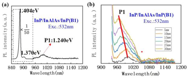 圖2. (a) 由532納米激光器(5毫瓦)激發(fā)的InP/InAlAs/InP(樣品B1)的光致發(fā)光(PL)光譜。(b) P1隨著激發(fā)功率從5到30毫瓦變化時的演變。