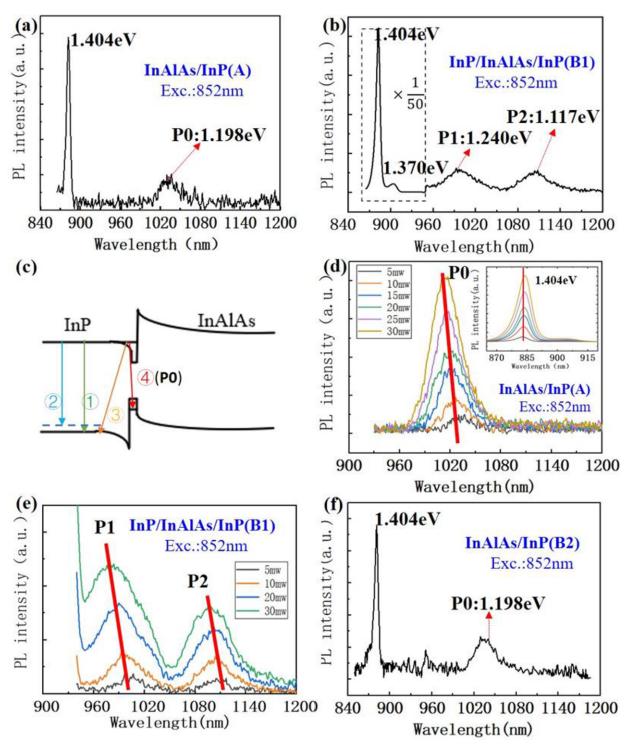圖1.(a) 單異質(zhì)結(jié)構(gòu)InAlAs/InP(樣品A)和 (b) 雙異質(zhì)結(jié)構(gòu)InP/InAlAs/InP(樣品B1)在77 K下被852 nm激光器(5 mW)激發(fā)的光致發(fā)光(PL)光譜。(c) 直接界面的混合型I-II(InAlAs-InAs-InP)異質(zhì)結(jié)構(gòu)的能帶結(jié)構(gòu)。(d) 和 (e) 分別為樣品A中P0以及樣品B1中P1和P2的功率依賴性PL光譜(5–30 mW)。圖(d)中的插圖顯示了1.404 eV峰值的功率依賴性PL光譜(5–30 mW)。(f) 沒有InP的雙異質(zhì)結(jié)構(gòu)InP/InAlAs/InP(樣品B2)在77 K下被852 nm激光器(5 mW)激發(fā)的PL光譜。