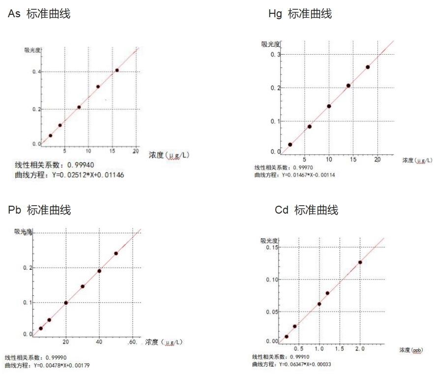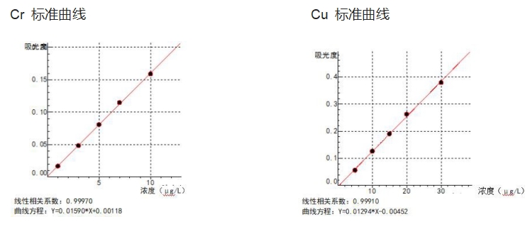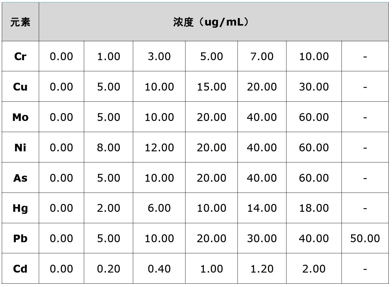 按下表配制各元素的系列標(biāo)準(zhǔn)溶液,待儀器工作穩(wěn)定后,依次進(jìn)樣,根據(jù)濃度和吸光度,繪制標(biāo)準(zhǔn)曲線。