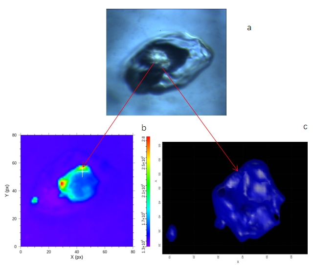 圖2 包裹體的明場圖像(a)、內(nèi)部剖面圖(b)和三維成像圖(c)