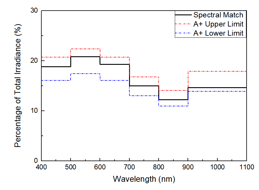 光譜匹配度定義為在6 個光譜波段內(nèi),積分得到的光譜輻照度占總輻照度的百分比,與標準太陽光譜中各個波段所占百分比的比例。例如A +級光譜匹配度規(guī)定,各個波段的占比與標準光譜的占比的比例,范圍不得超過0.875-1.125。