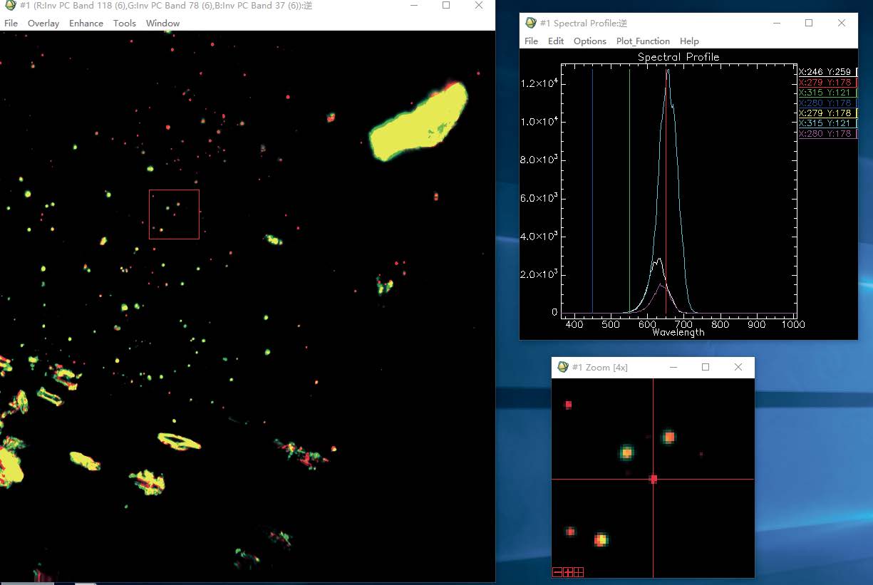• 暗場散射高光譜(下圖),左部為高光譜相機拍攝的高光譜圖像,顆粒顏色為根據(jù)光譜中心波長及帶寬合成的偽彩圖,右部為局部高光譜圖及單顆粒的光譜
