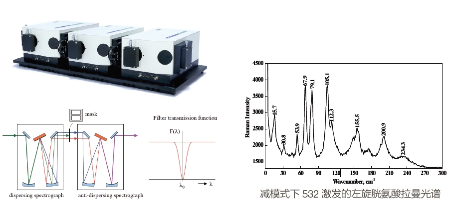 三級聯(lián)譜儀工作在減模式下時,可以獲得超高雜散光抑制比,適用于可調諧激光波長的可見或紫外共振拉曼,或者超低波數(shù)拉曼。