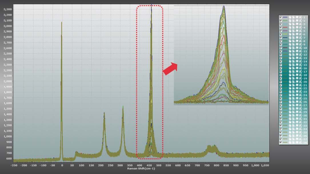 檢測條件:532nm 激光器,100μm 狹縫寬度,Multitrack模式下100x 物鏡(0.9NA),樣品上激光功率10mW,積分時間300s, 累積次數(shù)1,600 刻線光柵