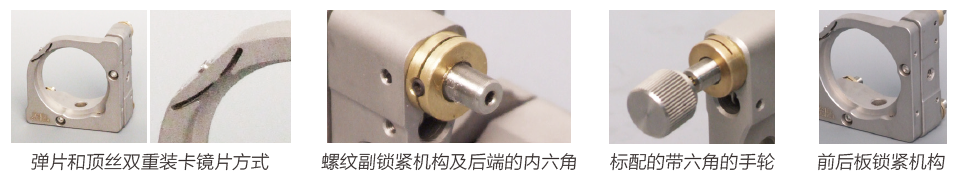 • 雙重鎖緊機構(gòu):不僅螺紋副帶鎖緊機構(gòu)(除12.7鏡架外),前后板設計也有可鎖緊的螺紋孔;
